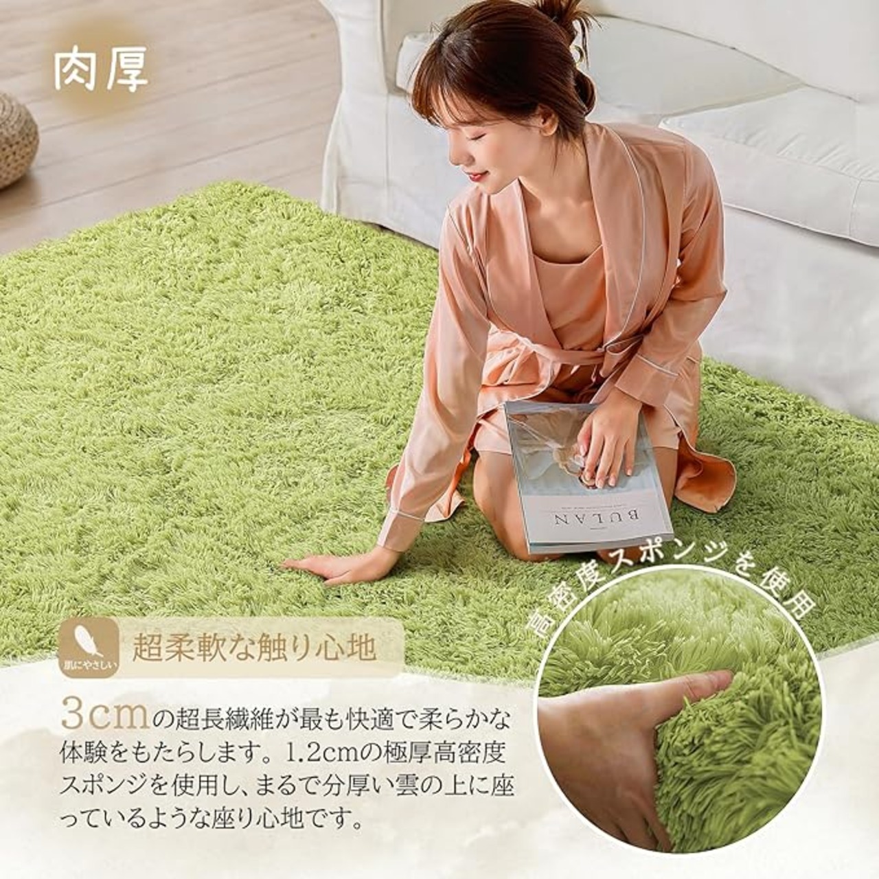 【高クッション性】12mmの厚みで、通常のカーペットより柔らかく、足元に優しい設計。リビング、寝室、玄関、床暖房など、さまざまなシーンで活躍