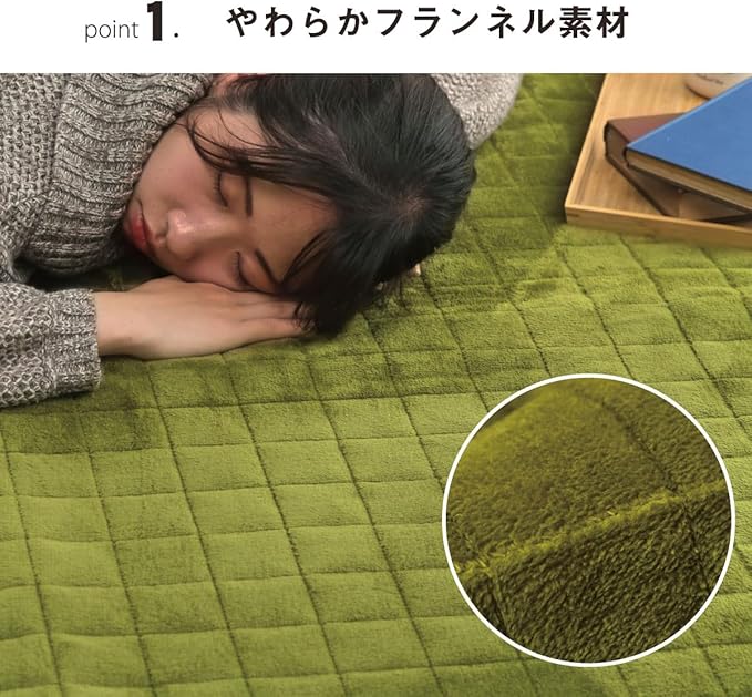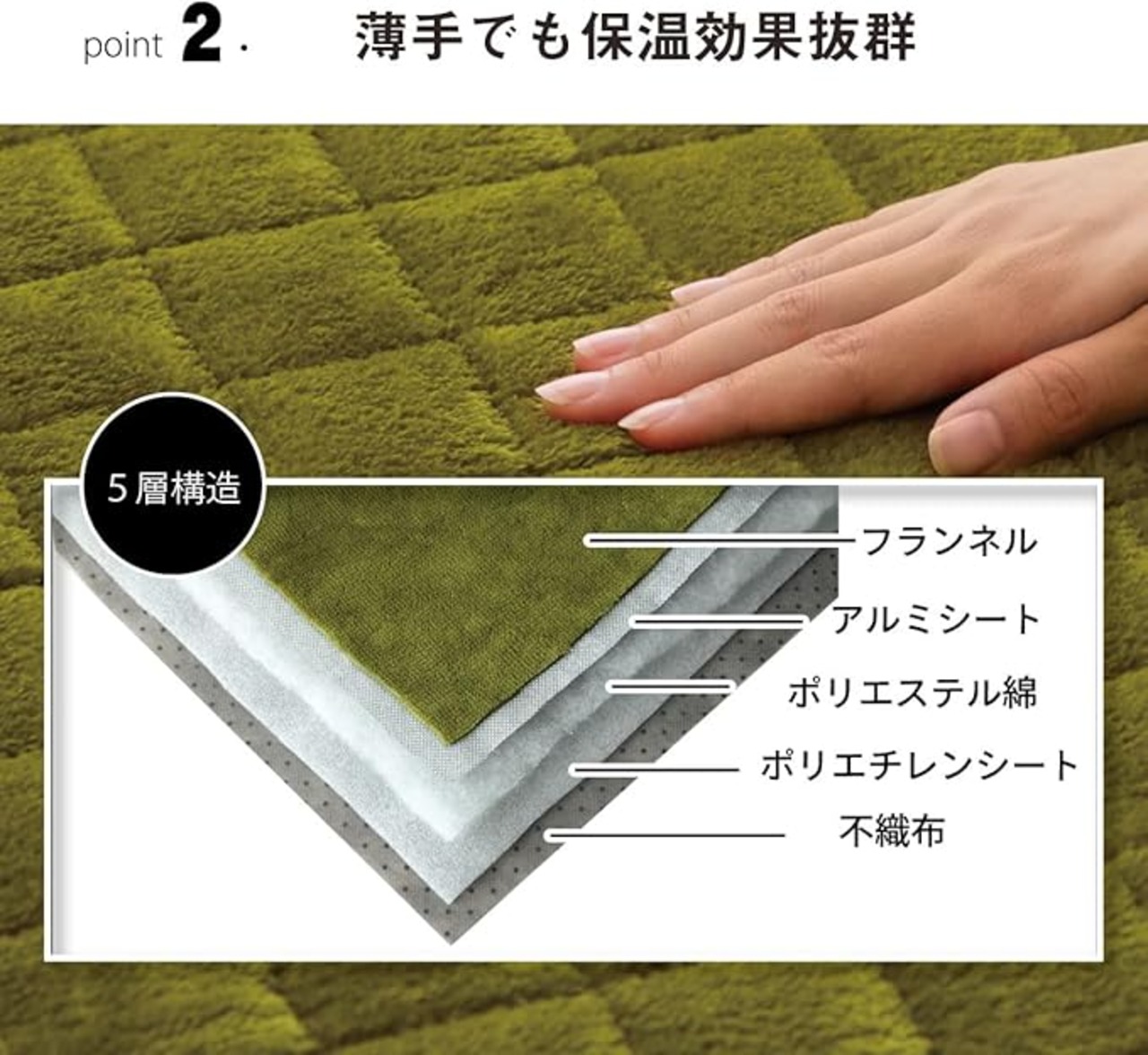 表地は保温性のあるフランネル生地で,ずっと触っていたくなるようなやわらかな肌触りです。中材にアルミシート・ポリエチレンシートを使用することで蓄熱・断熱機能があるため,冬の寒い日でも床からの底冷えを軽減します。床暖房・ホットカーペットにも対応しています。こたつの敷布団としてもご使用いただけます。無地でカラーバリエーションも豊富なため,どのようなお部屋にも合います。