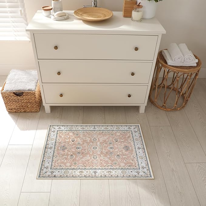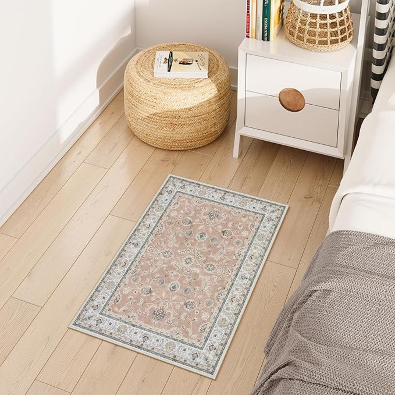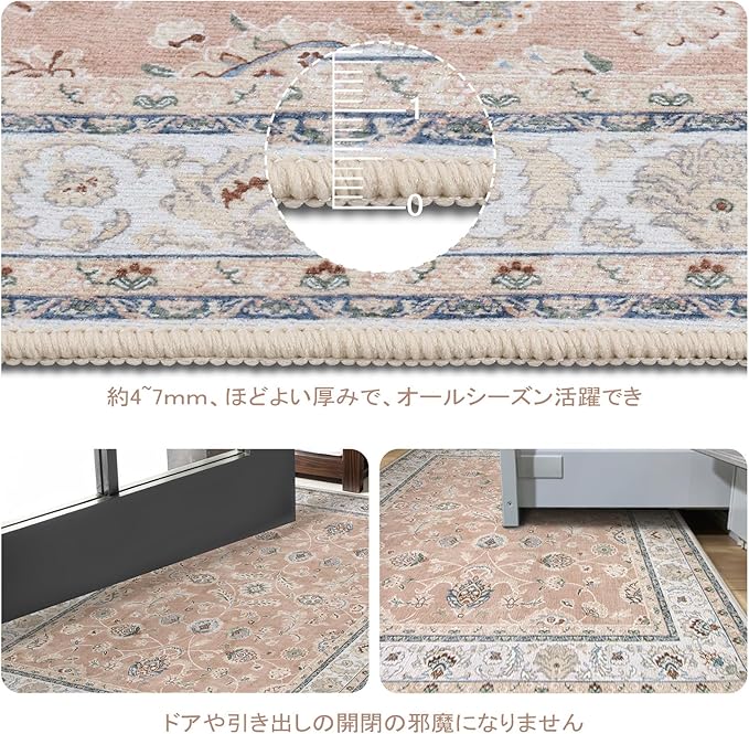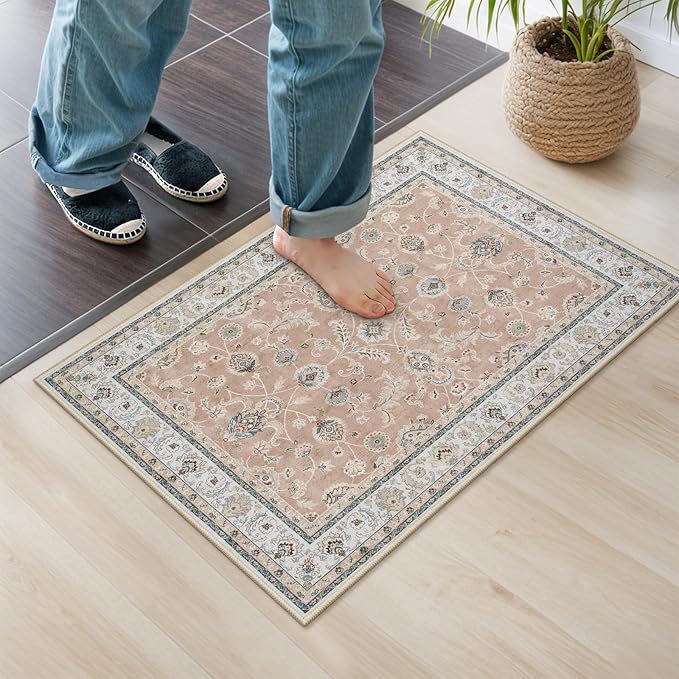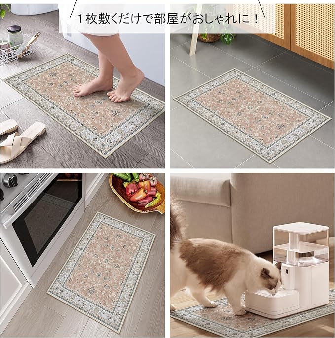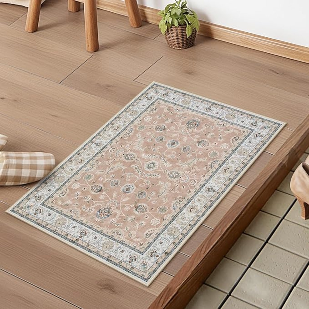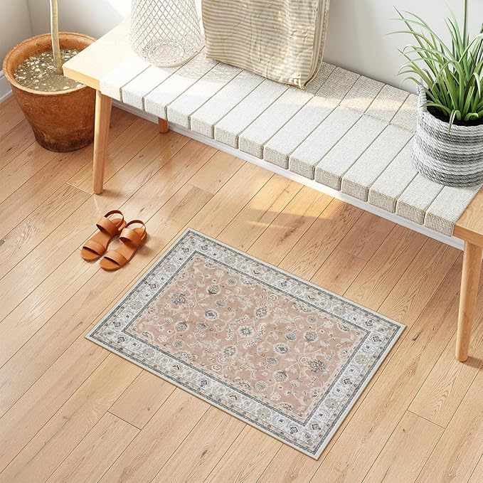HAOCOO 玄関マット 室内 50х80cm ペルシャ絨毯風 小さい ラグ おしゃれ 洗える 長方形 耐磨耗性 すべり止め 防音 ラグマット 屋外 泥落とし シェニール オールシーズン適用 抗菌防臭 花柄 コーラルピンク