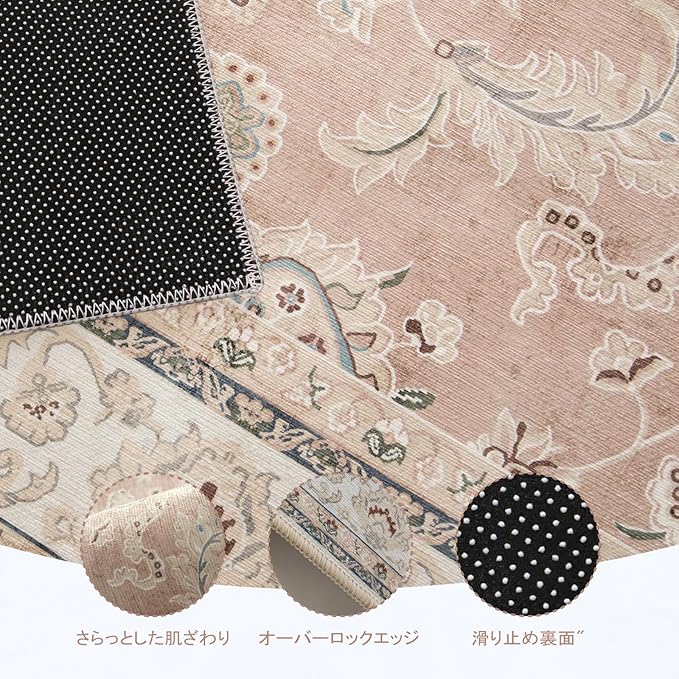 【ペルシャ風デザイン】先端の印刷技術より駆使され、平織り生地に繊細な画像がプリントされ、絨毯の上品さ を演出します。また、伝統的なペルシャ風柄を現代にアレンジし、シンプルなお部屋のアクセントとしてもおすす めします。端縁にはオーバーロックの加工を施し、遊び毛が出たり、形を崩れたりしにくく、優れた耐久性を実現 します。更に、角は細いパイピングで、軽やかな印象に仕上げています