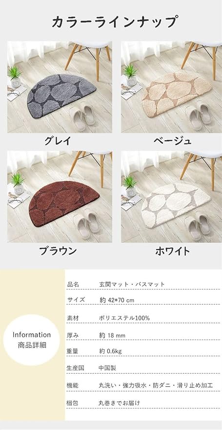 【場所】バスマット、洗面所マット、玄関マット、足拭きマット、お風呂マット、ソファーマット、インテリアマット、カーペット、ラグマットなどの多目的に使用していただけます。