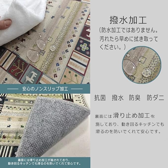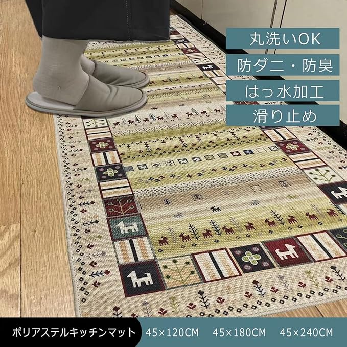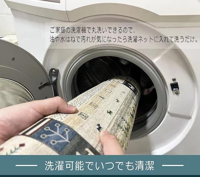 ※ ポリエステル繊維を使用し、撥水加工が優れている商品です。 (防水加工ではありません。汚れたら早めに拭き取ってください。) ※ ご家庭の洗濯機で丸洗いできるので、油や水はねで汚れが気になったら洗濯機ネットに入れて洗うだけ。 ※ 選べる3サイズ:45X120CM 45X180CM 45X240CM 一人暮らしの方でもファミリーでも最適。 ※ 裏面は安心のノンスリップ加工 裏面には滑り止め加工が施されており、動き回るキッチンでも滑るのを防いでくれて安心です。