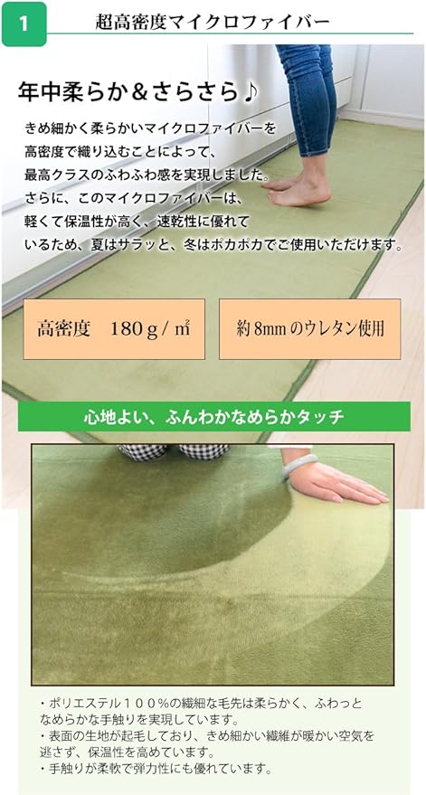 サイズ:50 180cm 表地:ポリエステル100% パイル長さ:約5mm 中材:ウレタンフォーム約8mm 裏面:不織布(滑り止め加工)