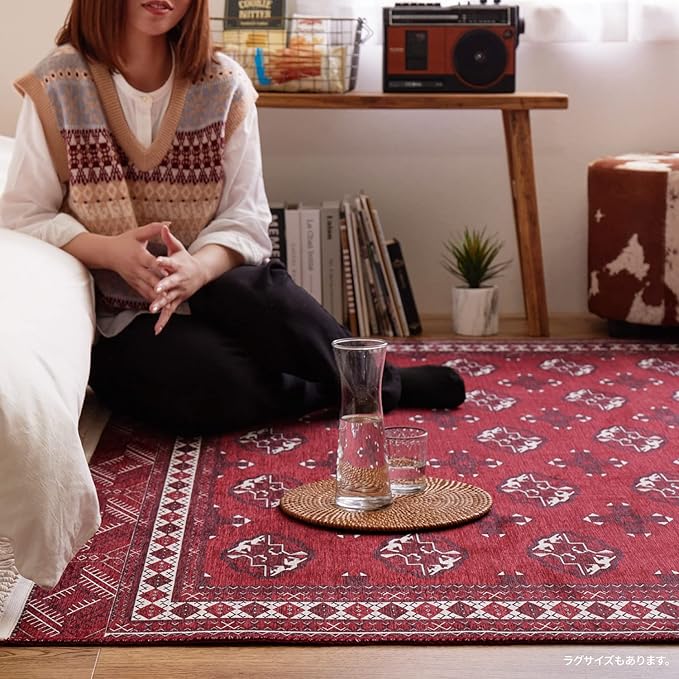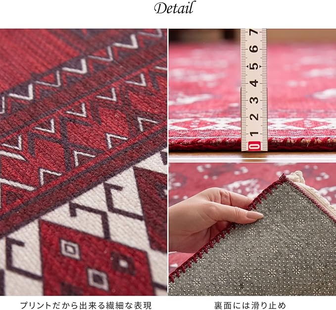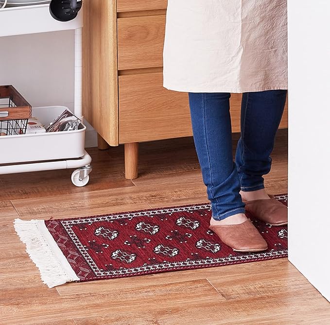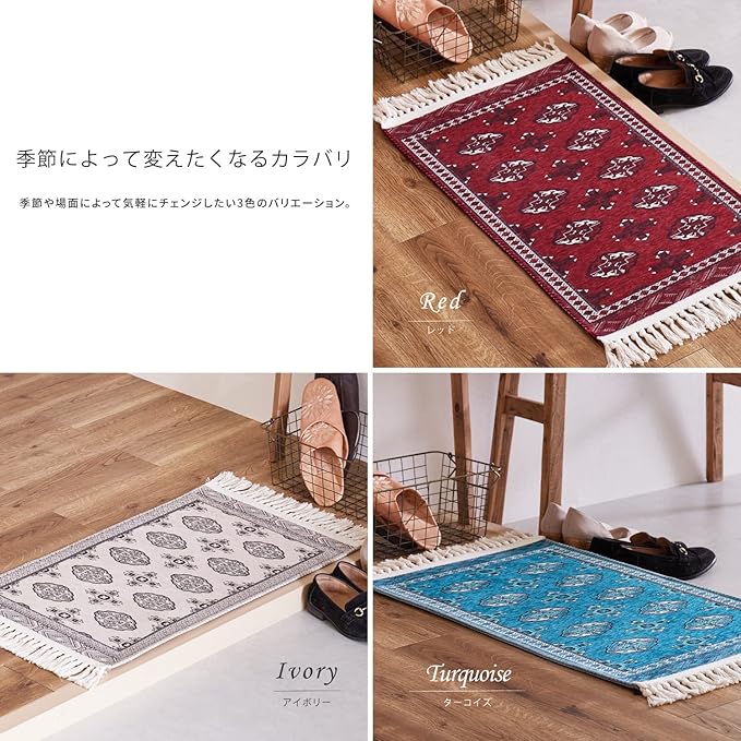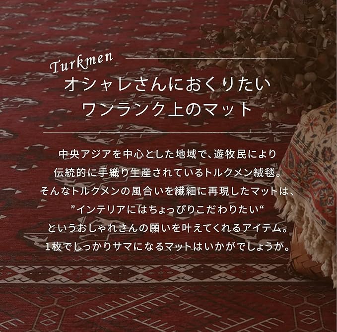 伝統的なトルクメン絨毯を再現した玄関マット。毛足がほとんどないため、さらっとした手触りです。ゴミが溜まりにくくお手入れも簡単。また、洗濯機で洗えるので汚れても清潔にお使いいただけます。玄関やベッドサイド、キッチンなどの水回りにもどうぞ。