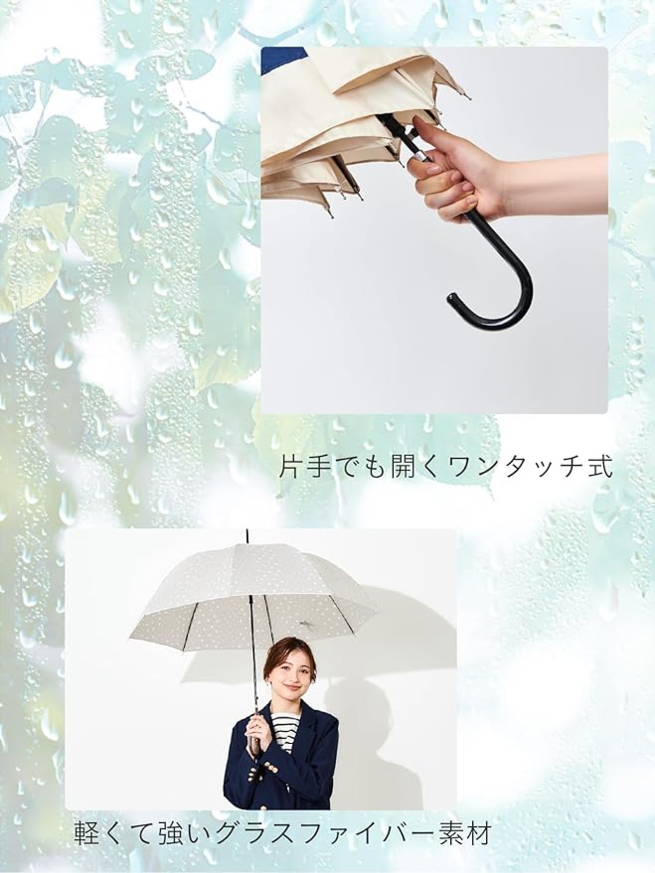 【片手でも開けられるジャンプ傘】 ワンプッシュで開くジャンプ傘。片手がふさがっていてもぱっと開けるから、荷物の多い日も気にせず持ち運びラクラクです。