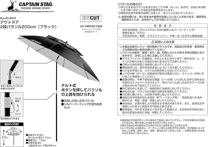 【Amazon.co.jp 限定】 限定商品限定商品 パラソル 傘 日傘 日除け UVカット アウトドア 2段 チルト パラソル 径200 高さ210cm 収納バッグ付き ブラック UD-70