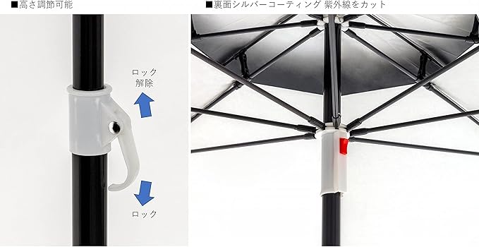 材質:傘生地の組成/ポリエステル100%(裏面シルバーコーティング)、親骨の長さ/97cm、親骨/グラスファイバー、中棒/鉄(エポキシ樹脂塗装)、原産国:中国