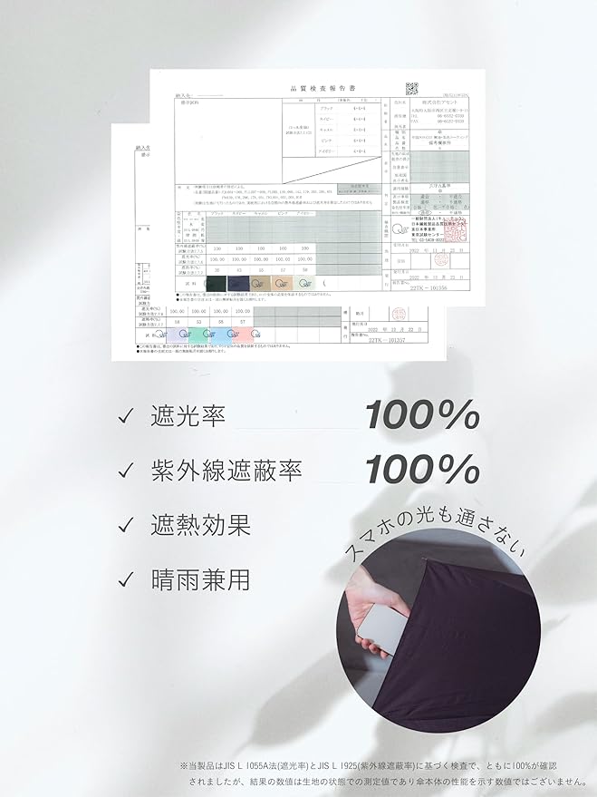 (※)当製品はJIS L 1055A法(遮光率)とJIS L 1925(紫外線遮蔽率)に基づく検査で、ともに100%が確認されましたが、結果の数値は生地の状態での測定値であり傘本体の性能を示す数値ではございません。また、商品生産時期により付属品等への記載が「99%」等の表記の場合がございます。その場合でも検査上「100%」を確認した商品ですので、予めご了承くださいませ。