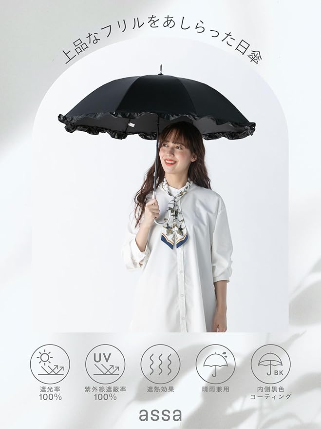 assa 日傘 UVカット 一級遮光 長傘 レディース 軽量 遮光率 紫外線遮蔽 100% 遮熱効果 内側黒色 遮光 熱中症対策 晴雨兼用 パラソル グラスファイバー コンパクト FL 50cm
