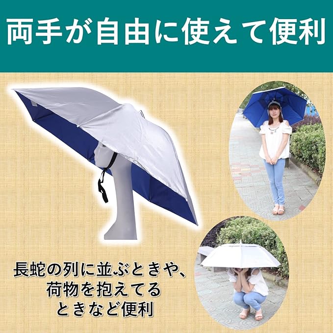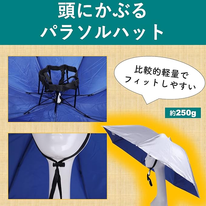 ハンズフリーで傘を使える、頭にかぶるタイプのパラソルハット。釣りや農作業など様々な場面でご使用いただけます。