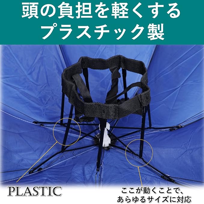 傘の骨の部分で固定する紐をスライドさせて、頭周りのサイズを変更できます。お子さまから大人までサイズの調整が可能です。ご自身に合ったサイズで使えるので、頭への負担も軽減します。