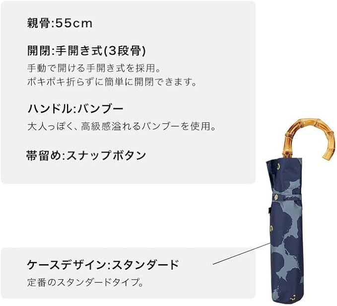 Wpc. Patternsで人気の北欧風テキスタイルを、日傘として持ちやすいカラーに仕上げました。 親骨55cmと大きめサイズだから、真夏の強い日差しや紫外線もしっかりと遮ります。 バンブーハンドルを使用することで、温かみのあるナチュラル感が可愛いロングパラソルです。