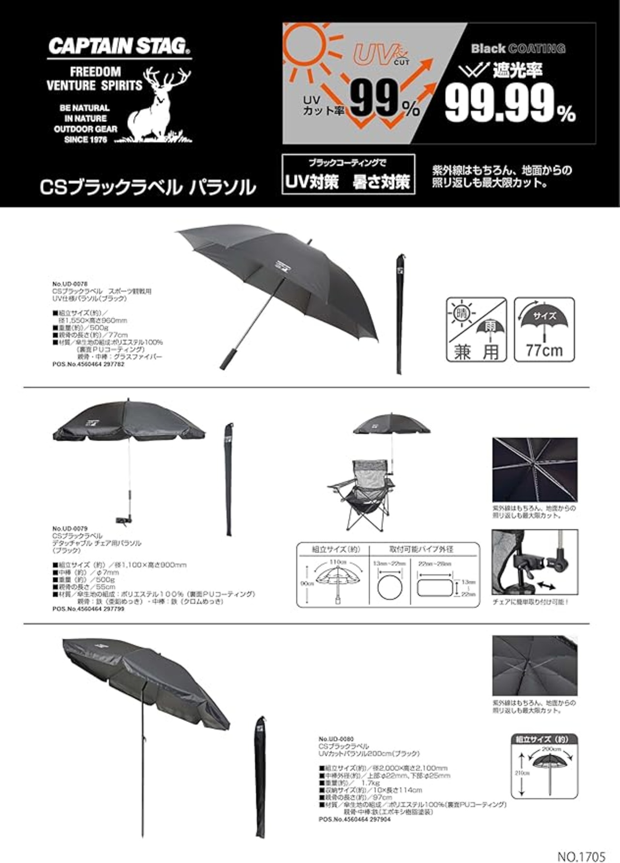 限定商品限定商品 パラソル 傘 日傘 日除け UVカット デタッチャブル チェア用パラソル スポーツ観戦用 収納バッグ付き ブラック CSブラックラベル UD-78/UD-79/UD-80