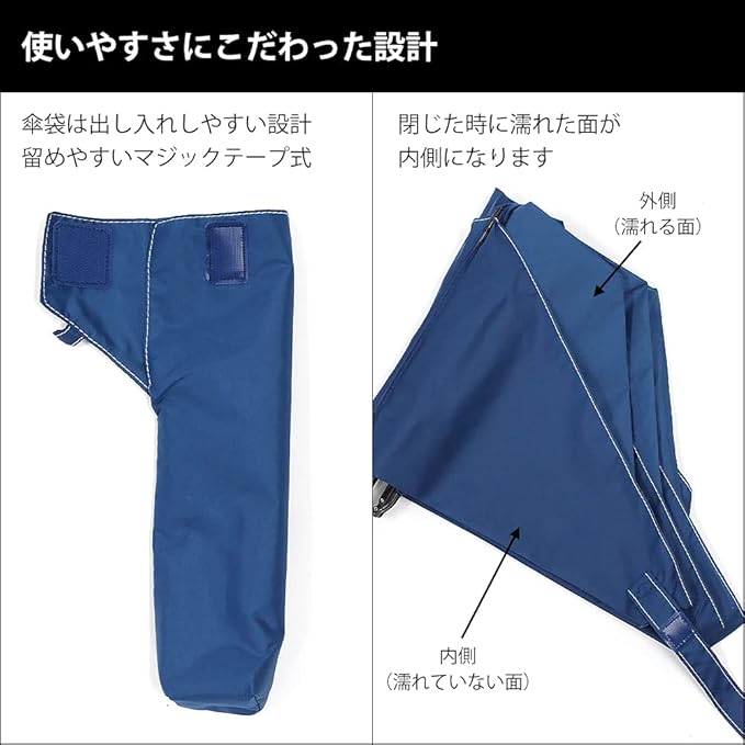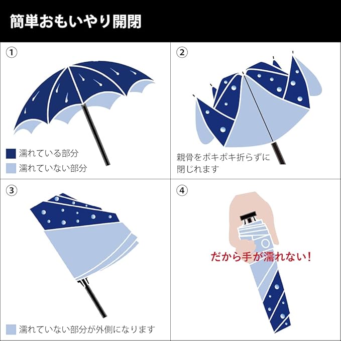 傘骨をポキポキ折らなくても、ろくろを上げ下げするだけで簡単に開閉できる「簡単おもいやり開閉」機能。閉じる時は濡れた面が内側になるので、傘をたたむ時や持ち歩く時に手が濡れません。生地の表面をほとんど触らずにたためるので、手の皮脂や汚れがつきにくく撥水力が長持ちします。