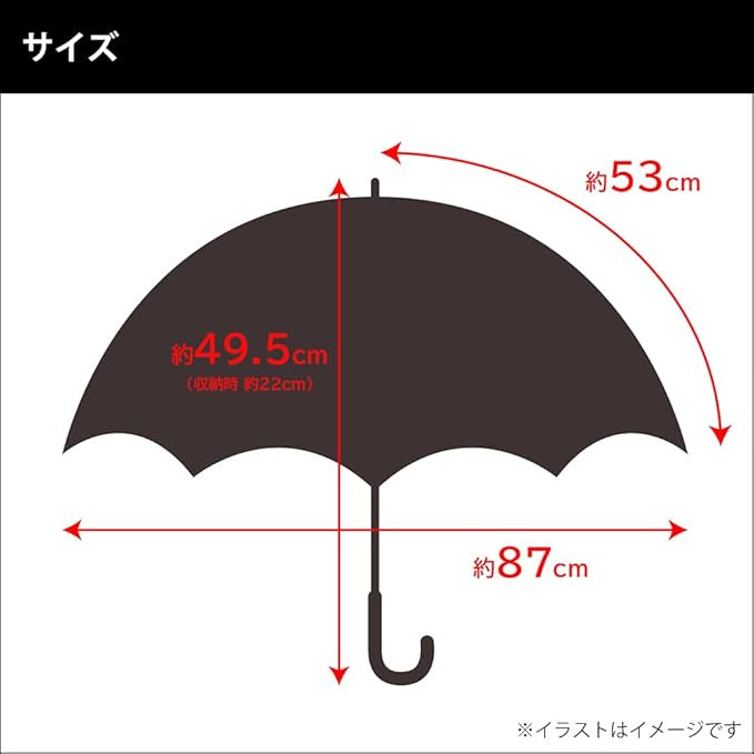 サイズ :親骨53cm 全長23cm 重量118g(本体110g) 直径(最大)93cm 生地:撥水ポリエステル100% 親骨:東レカーボン、中棒:アルミ