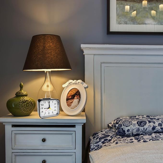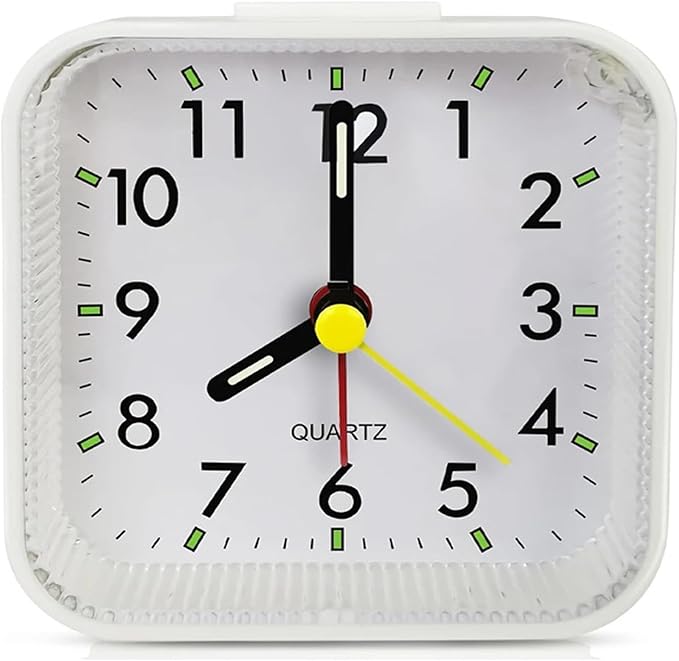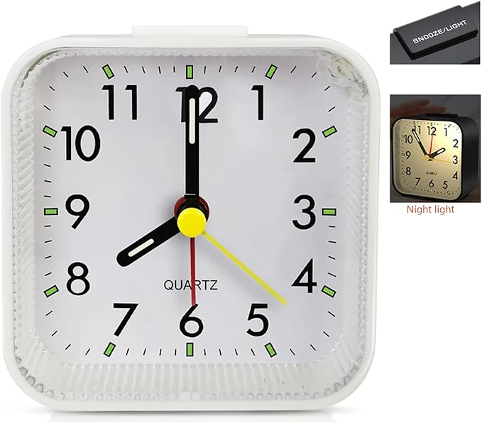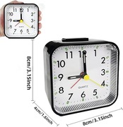 小型クォーツアナログ目覚まし時計、ホワイトまたはブラック選択可能、スヌーズ機能付き、内蔵ナイトライト、サイズ8x8x3.15cm、アラーム機能付き、卓上時計(電池別売) (白)