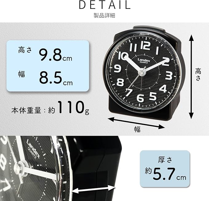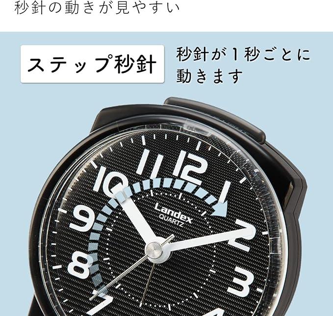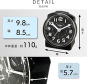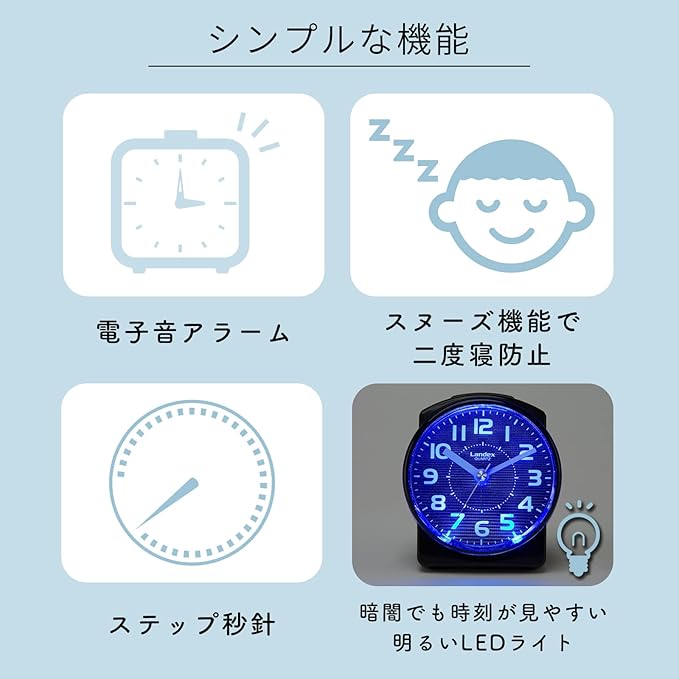 機能・仕様:ステップ秒針、電子音アラーム、スヌーズ機能、LEDライト(青色)