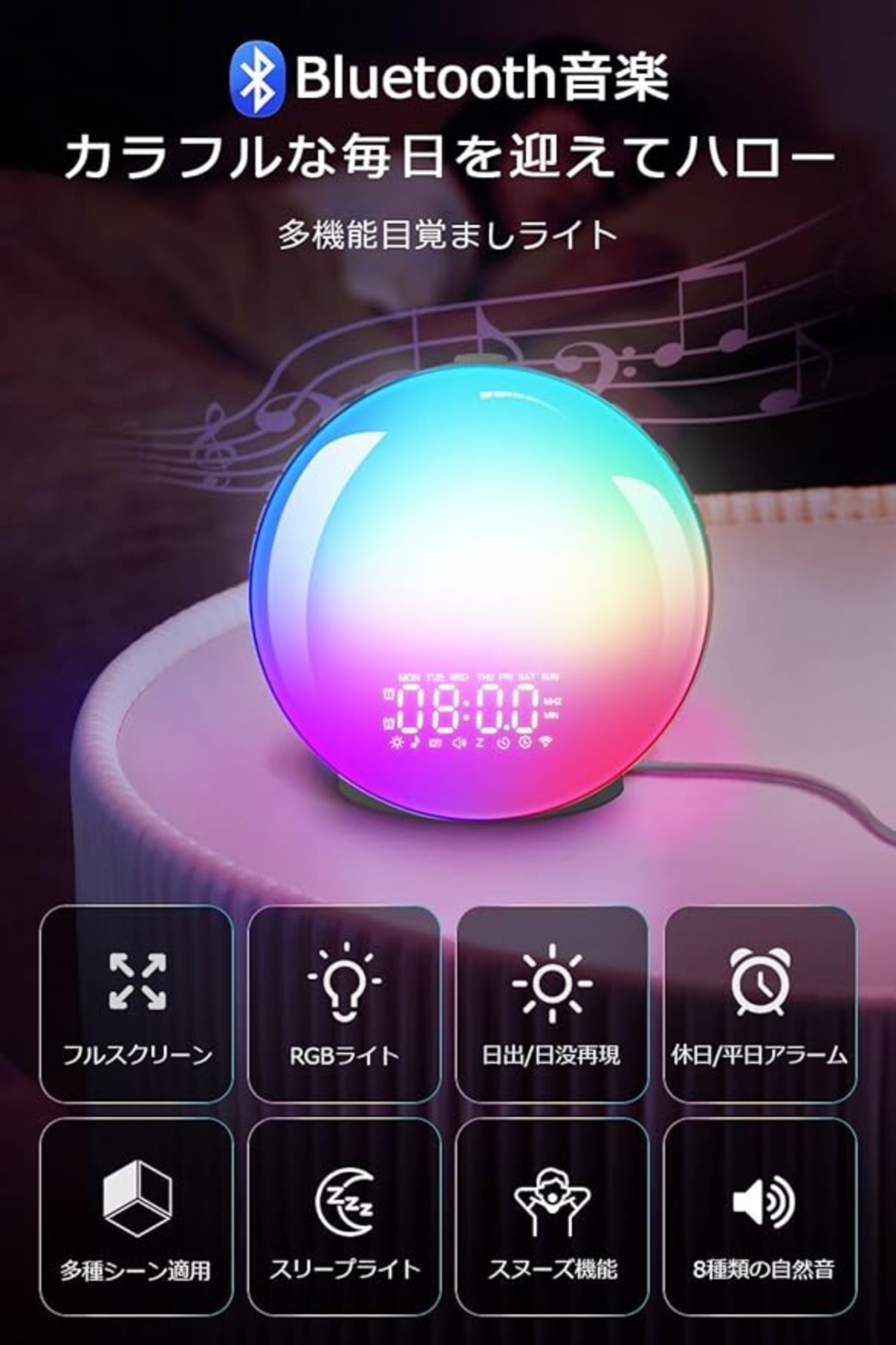 目覚まし時計 光 目覚ましライト 【Bluetooth音楽・休日/平日アラーム設定】 めざまし時計 大音量 日の出&日没シミュレーション搭載 8種類自然音・20段階明るさ調整・16段階音量調節 光で起きる 置きどけい RGB/虹色ライト 光目覚ましどけい スヌーズ&FMラジオ機能付き 明るさ調整可 フルスクリーン照明 ベッドサイドランプ 授乳 寝室・子供部屋