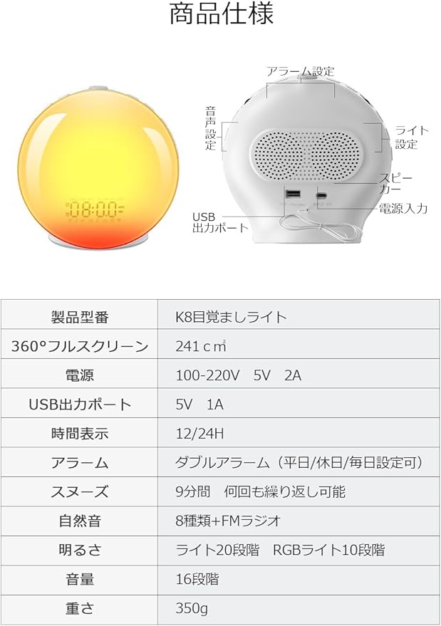 ▶【ギフトにも最適&パッケージ内容】 ※本製品は充電式ではなく、電源接続でご使用ください。 セット内容:目覚ましライト 1、電源ケーブル 1、日本語取扱説明書 1。 おしゃれなデザインの光目覚まし時計は、誕生日プレゼント、出産祝い、結婚祝い、敬老の日、引越し祝い、クリスマスギフトなどに最適。家族・友人・恋人へのプレゼントにもおすすめです。