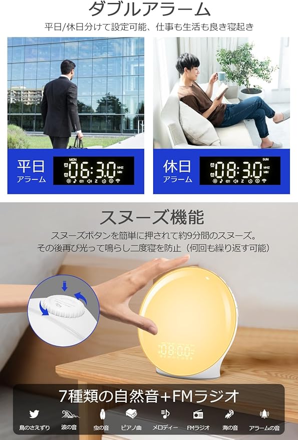 ▶【8種類の自然音アラーム&スヌーズ機能】 目覚ましライトには8種類の自然音を内蔵。鳥のさえずり・波の音・小川・オルゴールなど、多彩なサウンドで快適な目覚めをサポートします。スヌーズ機能付きで、アラームが鳴った時に大きなボタンを軽く押すだけで9分後に再アラーム。光で起きる+自然音のダブル効果で、心地よく一日を始められます。