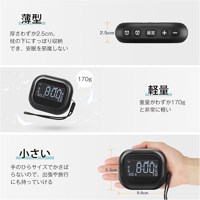 [薄型&軽量&コンパクト]厚さわずか2.5cm。薄型なので枕の下にすっぽり収納でき、安眠を邪魔しません。重量がわずか170gと非常に軽いです。手のひらサイズでかさばらないので、出張や旅行にも持っていけます。