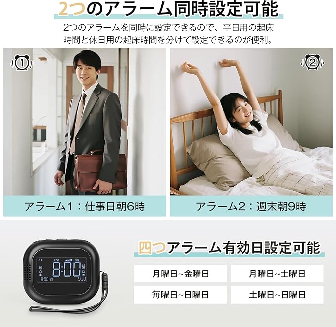 [2つのアラーム同時設定可能]2つのアラームを同時に設定できるので、平日用の起床時間と休日用の起床時間を分けて設定できるのが便利です。アラーム日は、月曜日~金曜日/月曜日~土曜日/月曜日~日曜日/土曜日~日曜日と四つパターンの設定ができます。
