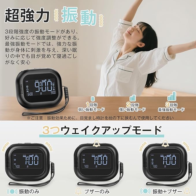 [強力振動、3段階強度調整]3段階強度の振動モードがあり、就寝時の環境や好みに応じて強度調整ができます。最強振動モードでは、強力な振動が身体に刺激を与え、深い眠りの中でも目が覚めて寝過ごしがなく安心です。周囲の家族に迷惑をかけずに起床できるのも魅力的。耳栓をつける人でも起きれます。かつ、振動のみ/音のみ/振動+音3つウェイクアップモードから選べます。