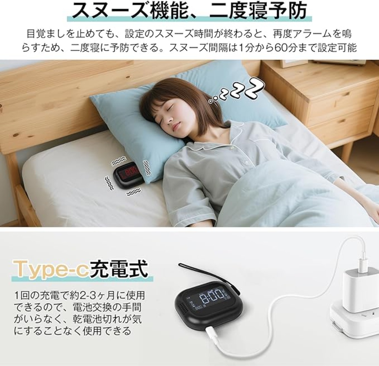 [スヌーズ機能、二度寝予防]目覚ましはスヌーズ機能が付きます。目覚ましを止めても、設定のスヌーズ時間が終わると、再度アラームを鳴らすため、二度寝に予防できます。スヌーズ間隔は1分から60分まで設定できます。早起きが苦手な人にオススメ。(※ご注意:振動効果ために、目覚まし時計を枕の下に挟むんで使用してください)