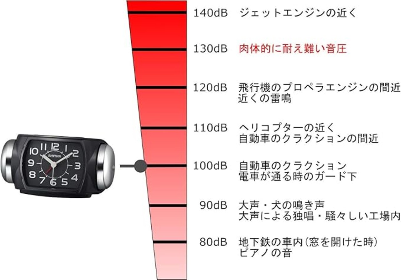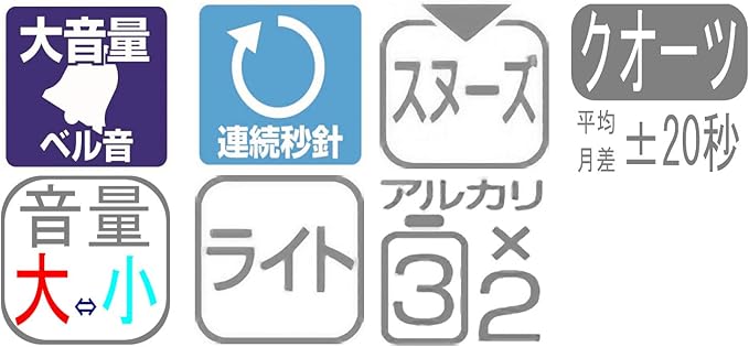 アラーム:大音量ベル音(大⇔小)切替式 (スマートな大音量ベル音目覚まし時計です。音量(大・小)切り替え式です。音の静かな連続秒針で秒針音が気になりません。)