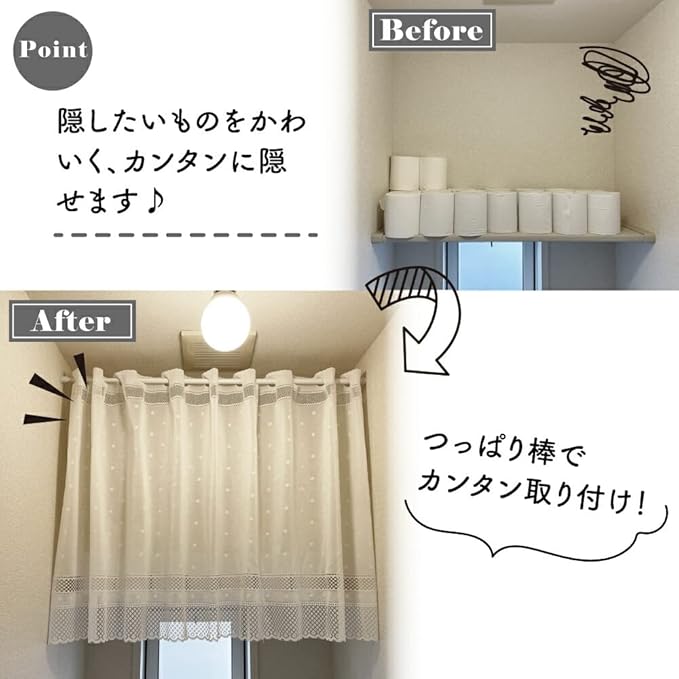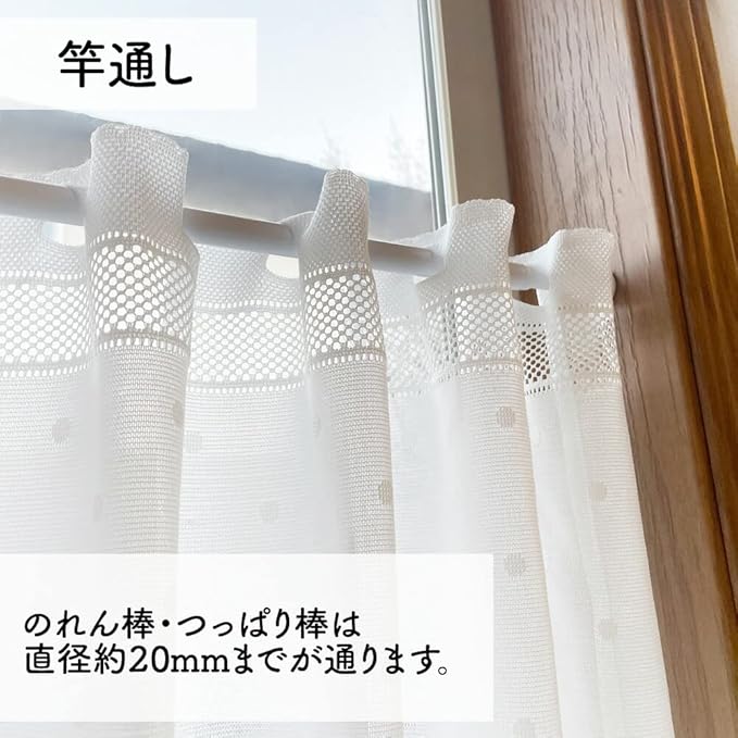 【仕様】直径約2cmのポール(棒)をギリギリ通すことができますが、直径約1.5cmくらいまでのポールの使用がおすすめです。(※つっぱり棒をご使用の場合は、両端のキャップの太さも考慮してください。キャップが取り外せるものもございます) 向こう側が透けて見えます。(カフェカーテンに視線を向けさせることによって、奥が気になりません。)