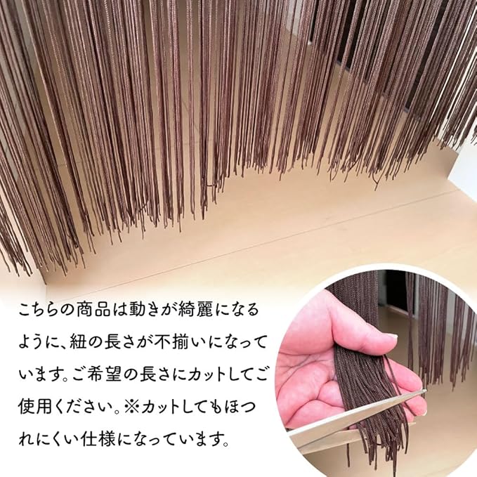 のれん工房のストリングカーテンは、レーヨン100%の紐で編み込まれた、しなやかで絡みにくい、弾力のある糸を特徴としています。約90cmの幅と210cmの丈を持ち、直径約4.5cmまでのポールを通すことができます。向こう側が透けて見えるため、奥が気になりません。光を取り込む透け感が心地よい、密度の高いストリングカーテンで、空間を仕切ることができます。美容室やバーなどのサロン、飲食店にもおすすめです。アイロンは低温でおかけください。