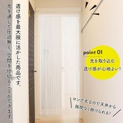 【ポイント】光を取り込む透け感が心地よい、ストリングカーテンです。密度が高く、しなやかな手触りです。透け感を最大限に活かした商品で、圧迫感なく空間を仕切ることができます。お部屋にはもちろん、美容室などのサロンやバー、飲食店にもおすすめです。