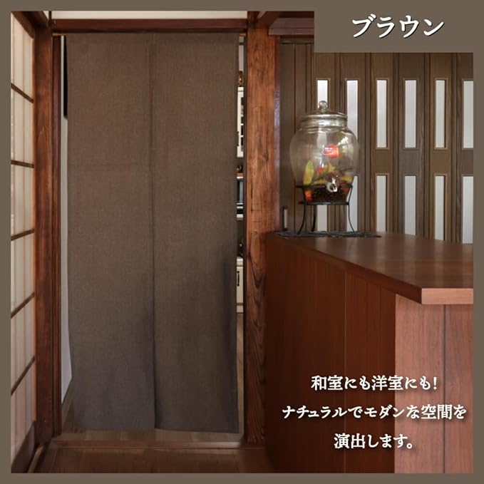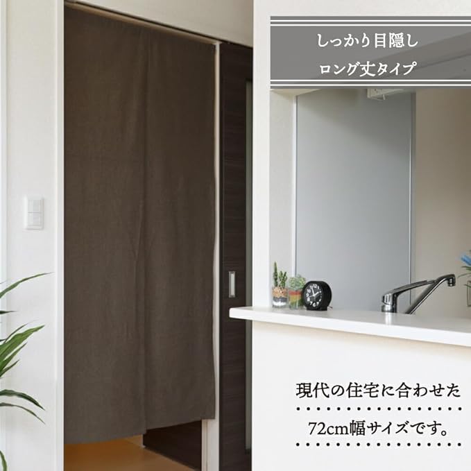 【ポイント】風合いのある綿混生地を使用したナチュラルなのれんです。お部屋に馴染みやすいカラー展開で、和室にも洋室にも奥行きのある和モダンな空間を演出します。現代の住宅幅に合わせた72cm幅サイズで、幅を余らせずにご使用いただけます。お部屋のインテリアにはもちろん、店舗や飲食店にもお使いいただけます。また、プレゼントや贈り物にも大変おすすめののれんです。