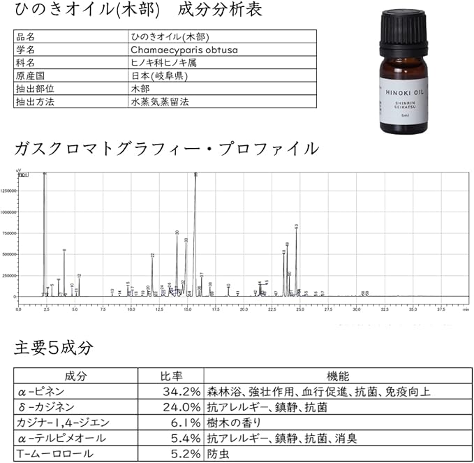 岐阜県の限定商品ひのき(東濃ひのき)の木部から抽出した100%天然ヒノキオイルの原液です。加水、加香は一切していません。