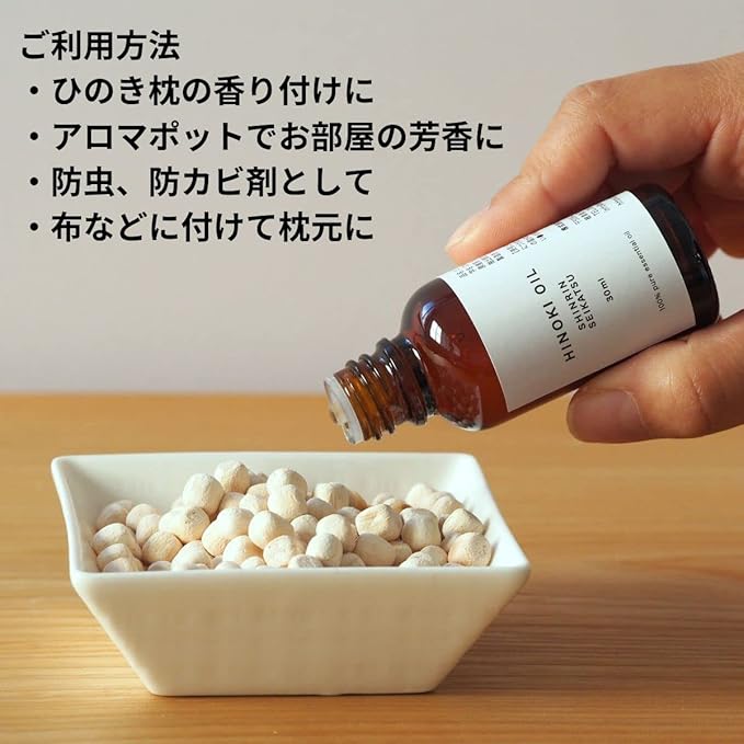 寝室、浴室などのカビが発生しやすい場所の防カビ剤としてもお使い頂けます。水200ccに対しヒノキオイルを2~3滴入れ、良く混ぜてから霧吹きなどでご使用ください。