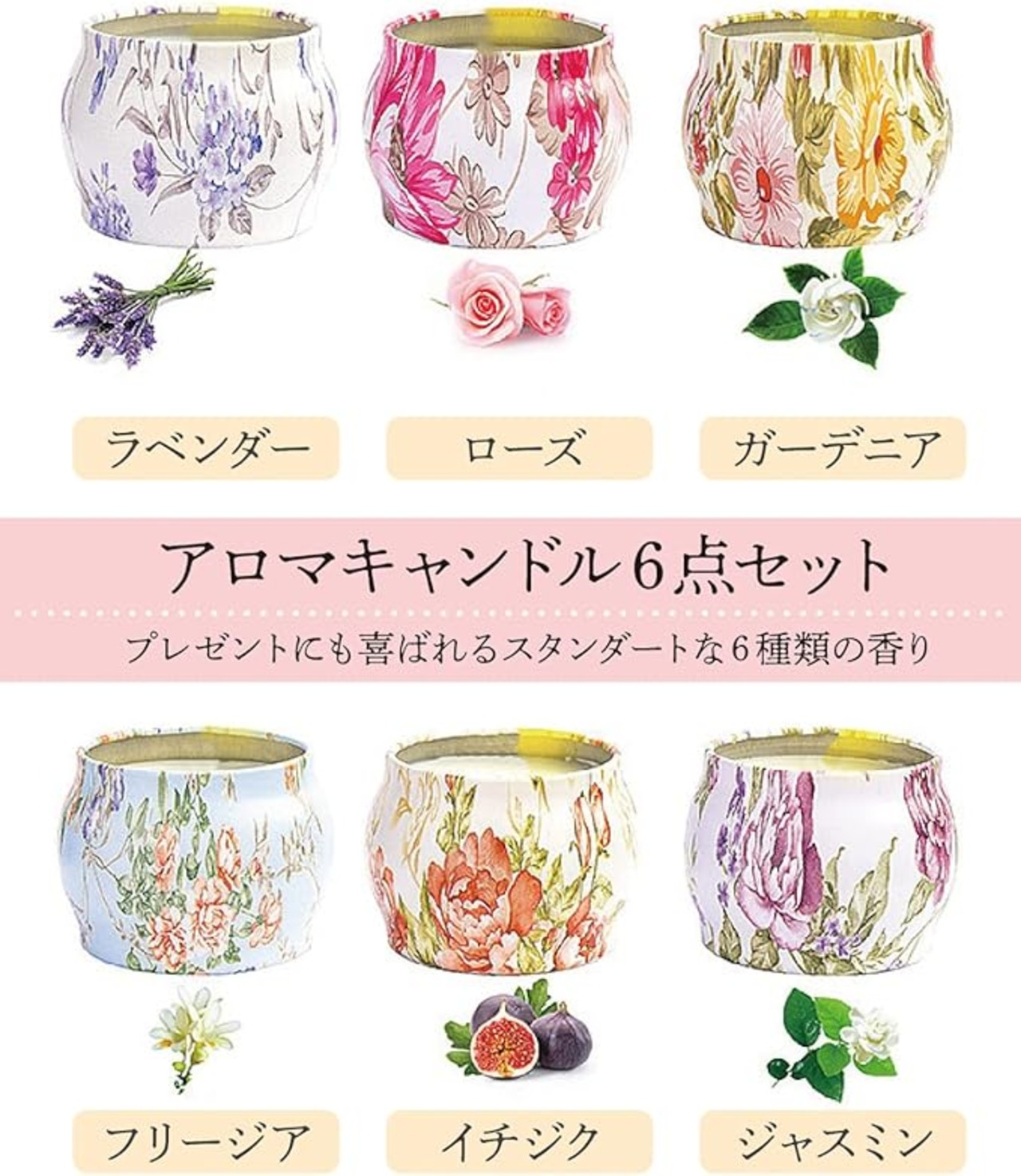 ✅【スタンダートな6種類の香り】 このアロマキャンドルギフトセットにはの6つのフレグランスが含まれ、アロマテラピーをご家庭でいつでもお楽しみいただけます。スタンダートなラベンダー・ジャスミン・フリージア・ローズ・イチジク・ガーデニアの6種それぞれの独特の香りが漂い、リラックスして幸せな気分になります。 アロマキャンドルの香りは心地よい雰囲気を演出し、ストレス解消や気分の改善にも役立ちます。
