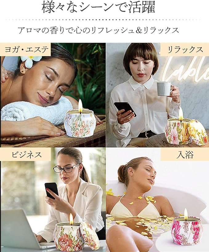 ✅【プレゼントにも最適】 アロマキャンドルはストレスを解消してリラックスすることができ、ギフトやプレゼントとしても喜ばれるアイテムです。多くの場所での使用に適しており、リラックスタイムの使用はもちろん、入浴、ヨガ、オフィスなど、様々なシーンで快適な雰囲気を作り出す事が出来ます。また美しいデザインのブリキの容器は使用後にも小物ケースや小さな植木鉢などに最利用する事が可能です。