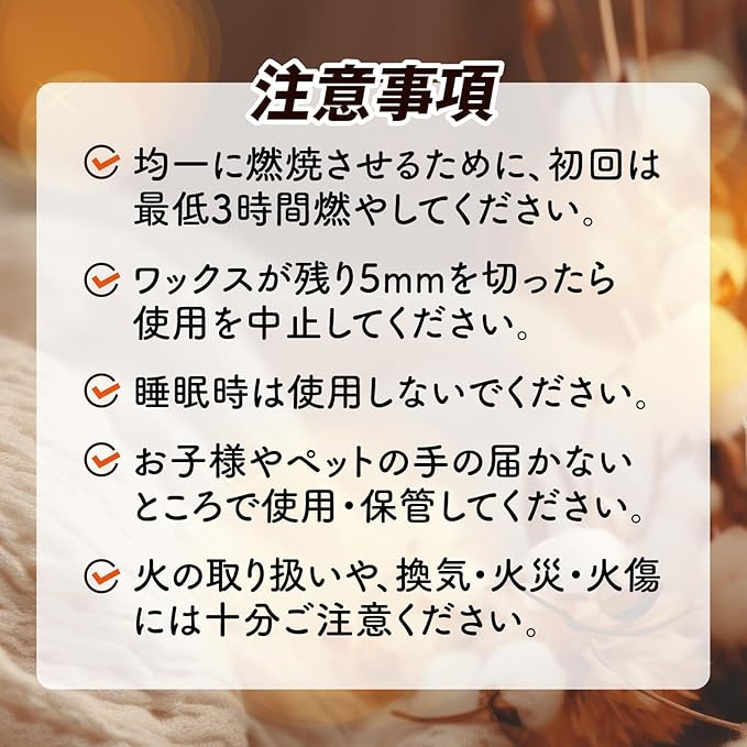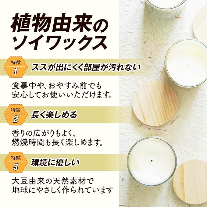 ✅植物由来のソイワックス!ススが出にくく部屋が汚れないので、食事中や、おやすみ前でも安心してお使いいただけます!また石油由来のパラフィンワックスと比べ、香りの広がりもよく、燃焼時間も長く楽しめます。