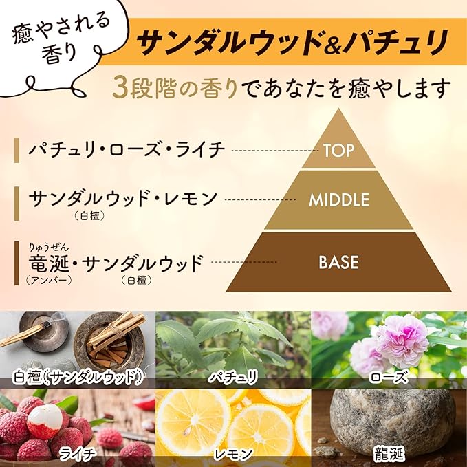 ✅癒やされるサンダルウッド&パチュリーの香り。3段階の香りであなたを癒やします。トップノートはパチュリーとローズとライチ、ミドルノートは白檀とレモン、ラストノートは龍涎と白檀です!