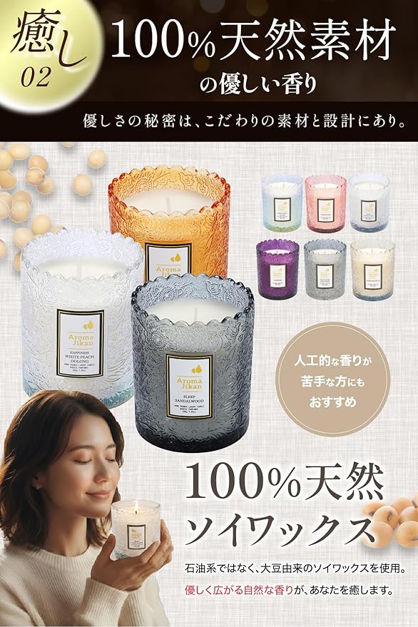 ・【100%天然素材】:天然精油&大豆ワックスから作られた100%天然素材のアロマキャンドルです。絶妙にブレンドされた香りは、まるで美しい自然に囲まれているように錯覚させます。無煙綿芯を使用する事で、香りが早く広がり、すすが出にくく、火を消した時に嫌な匂いがしにくい特徴がございます。