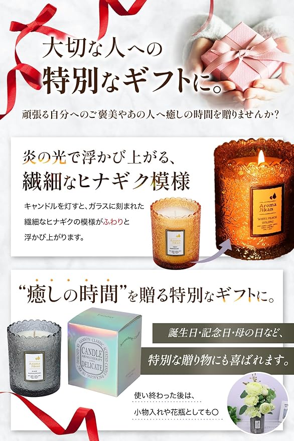 ・【お気に入りの香りをお選び下さい】:アロマキャンドルの炎には、副交感神経を刺激する効果があり、リラックスを促す作用が期待出来ます。また、炎の揺らぎは「1/fゆらぎ」と言われ、心を落ちつかせる作用があると言われています。下記のフレグランスを御用意しております:Mokuren(木蓮)、BerriesRose(バラ)、WhitePeachOolong(白桃ウーロン)、Lavender(ラベンダー)、BlackCedar&Juniper(森の香り)、LimeBasilOrange(ライムバジルオレンジ)、Sandalwood(白檀)、Kinmokusei(キンモクセイ)、Jasmine(ジャスミン)。