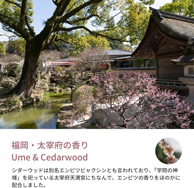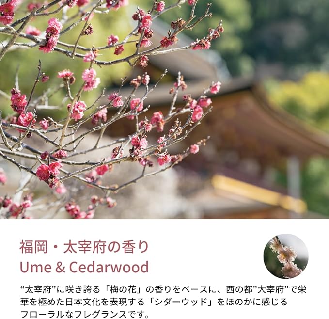 ■香りの特徴:Ume & Cedarwood “太宰府”に咲き誇る「梅の花」の香りをベースに、西の都”大宰府”で栄華を極めた日本文化を表現する「シダーウッド」をほのかに感じるフローラルなフレグランスです。 ちなみに、シダーウッドは別名エンピツビャクシンとも言われており、「学問の神様」を祀っている太宰府天満宮にちなんで、エンピツの香りをほのかに配合しました。