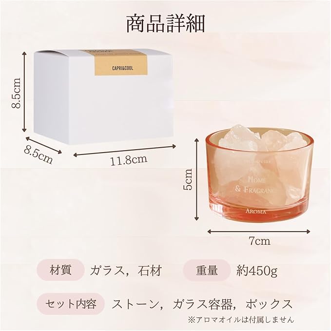 特徴 エッセンシャルオイル対応, ガラス製容器, クリスタルストーン付属, 天然石使用