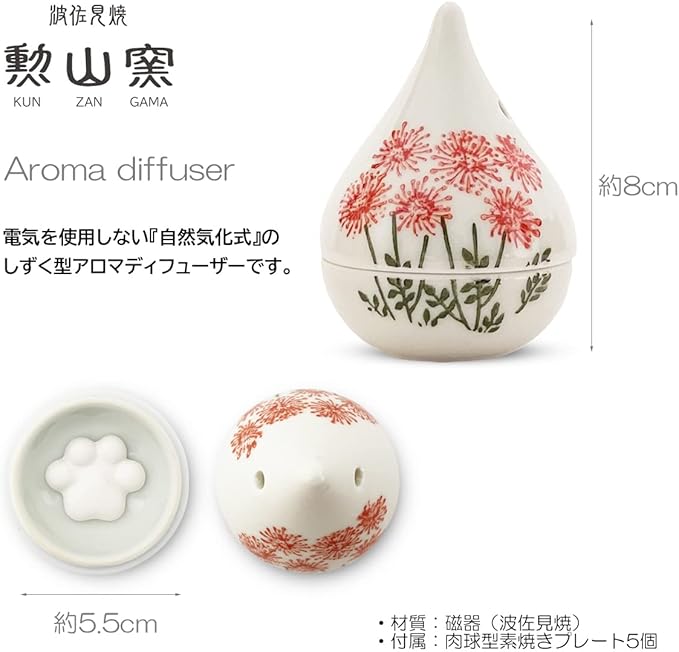 ジェイキッチンズ 勲山窯 アロマディフューザー 波佐見焼 日本製 5.5x8cm 肉球型 アロマストーン (アロマ プレート)5個付 野花 レッド コンパクト
