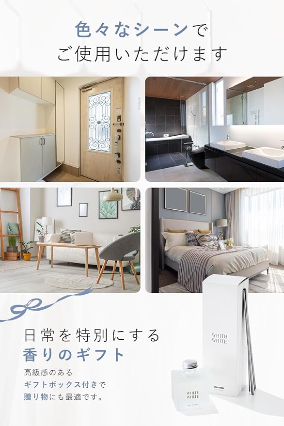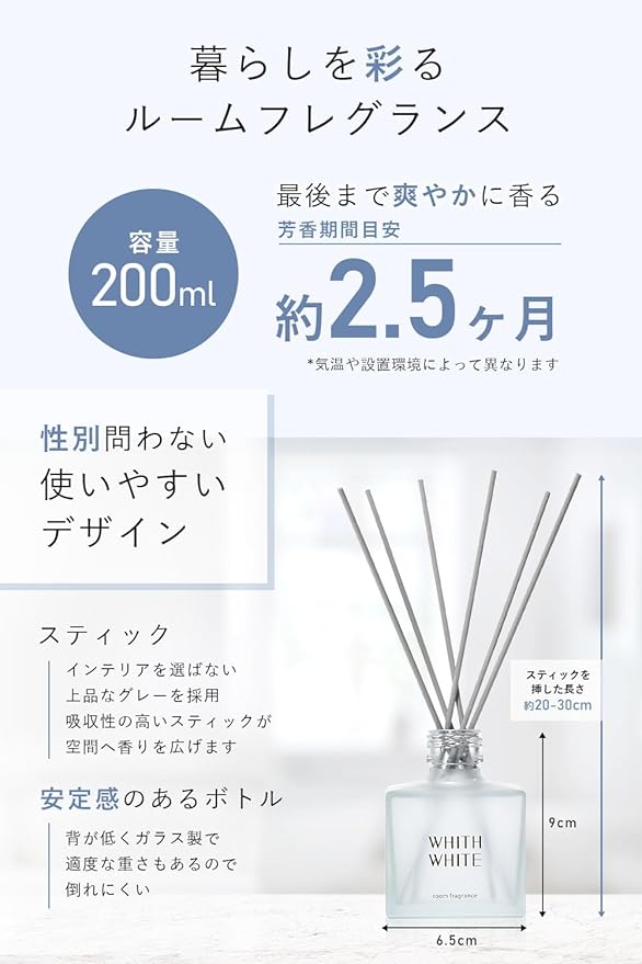 【インテリアに溶け込む】WHITH WHITE(フィス ホワイト) ルームフレグランス ギフト 香りが変化する 爽やか 優しい香り リードディフューザー 芳香剤 スティック付き 200ml 約2.5ヶ月分 サボン (Beautiful in White)