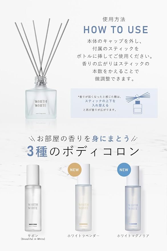 【 HOW TO USE 】本体のキャップを外し、付属のスティックをボトルに挿してご使用下さい。本数を変えて微調整できます。香りが弱くなったと感じた際は、スティックの上下を入れ替えると再び香りが広がります。