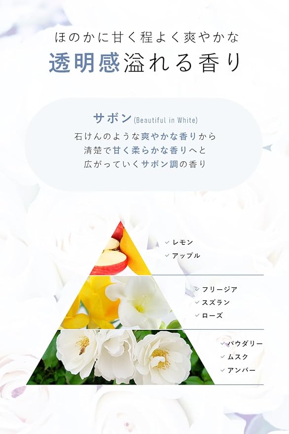 【 透明感溢れる香り 】石けんのような爽やかな香りから、清楚で甘く柔らかな香りへと広がっていくサボン調の香りです。