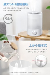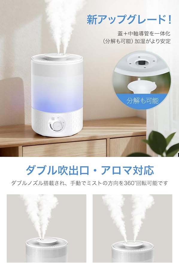 【ダブル吹出口・吹出口360 ・上から注水式】ダブルノズルも装備されており、手動で360 回転させることが可能です。これによって一箇所だけで過剰な加湿を防ぐことができます。上部給水方式なので、蓋を開けて直接水を補充することができます。(ご注意:最大水位は中軸導管より高くしないでください。)
