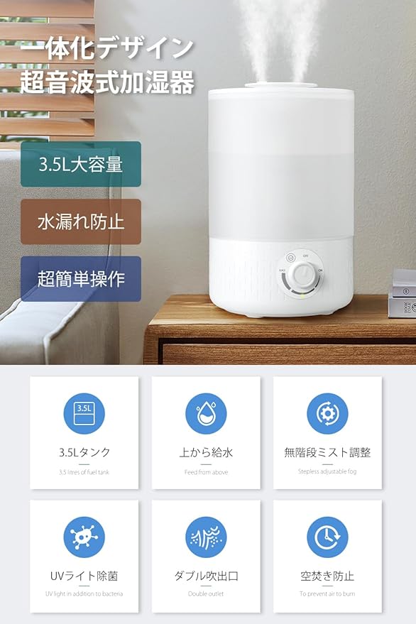 【2025年新改良・ダブル吹出口・3.5L】 加湿器 大容量 UVライト除菌 超音波式 加湿器 卓上 アロマ対応 上から注水 かしつき 無階段ミスト調整 54時間連続作動 空焚き防止 水漏れ防止 吹出口360 乾燥対策/花粉対策 静音 寝室/オフィス/会社/家庭用 日本語取扱説明書付き (ホワイト)