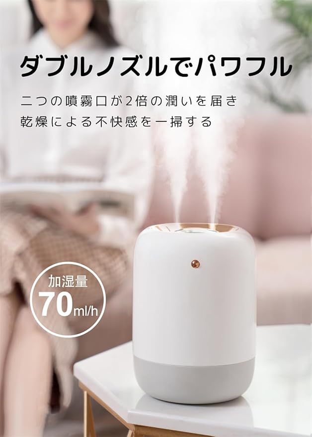 【ミストたっぷり】ダブルノズルのおかげで70ml/hのパワフル加湿ができ、倍の潤いで乾燥による喉・肌の不調をすばやく解消してくれます。 加湿量は2段階で切替が可能。お部屋の湿度やお好みに合わせて簡単に調節できます。 さらに1、3、5時間の切タイマーが自由に設定可能、ちょうど良い加湿生活を送ります。